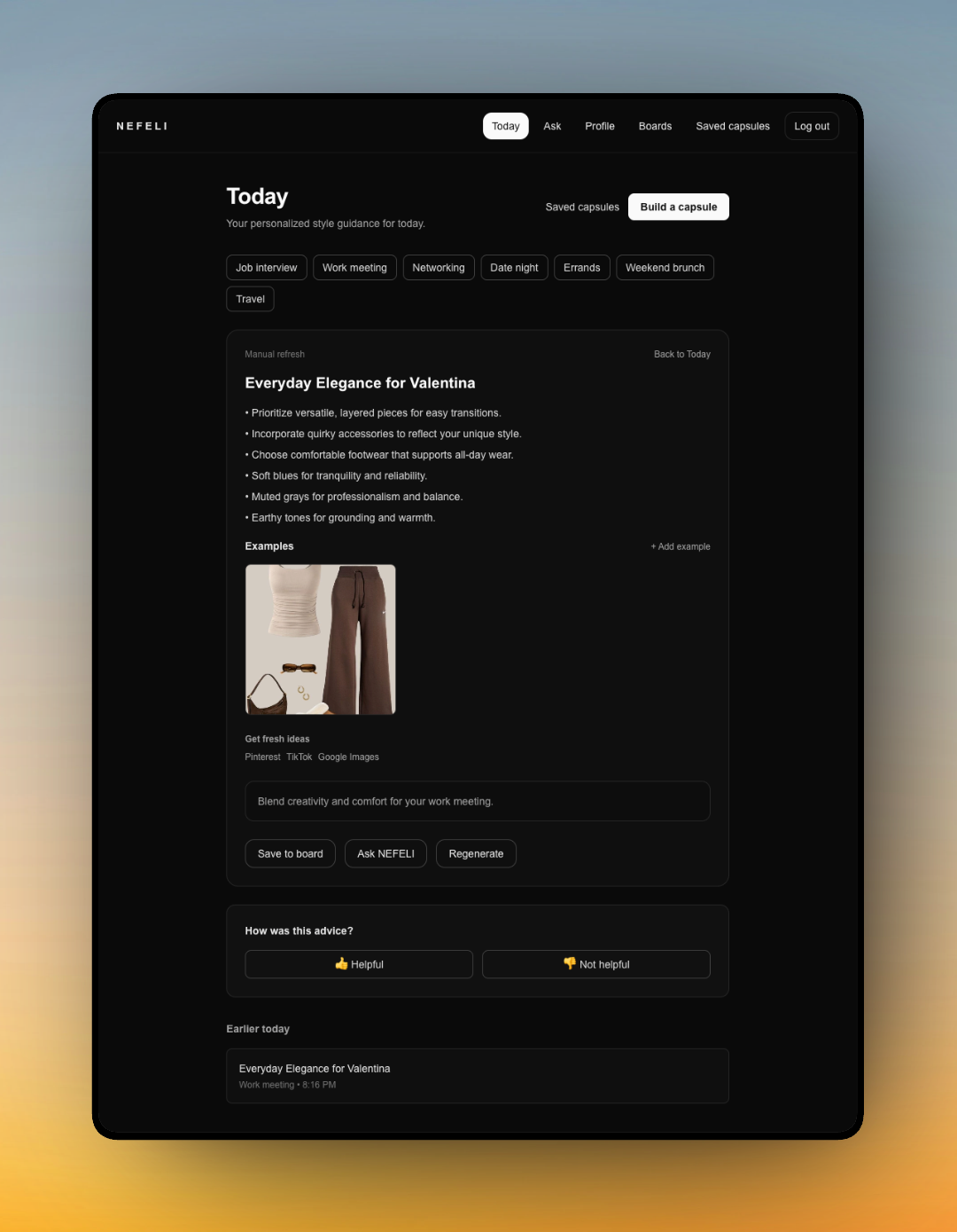 Nefeli is an AI-assisted outfit guidance tool built around a single design question: how do you make AI feel helpful rather than authoritative in a domain where there are no objectively correct answers? Most AI styling tools either overwhelm users with options, issue recommendations without explanation, or require so much input that the effort outweighs the value.